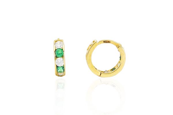 Arany baba fülbevaló bepattintós karika zöld és fehér kövekkel 7mm