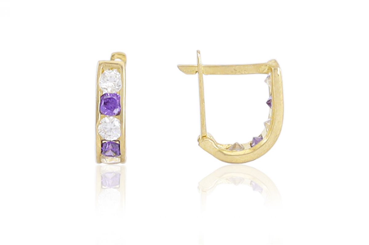 Arany baba fülbevaló franciakapcsos lila és fehér kővel 8mm belső méret