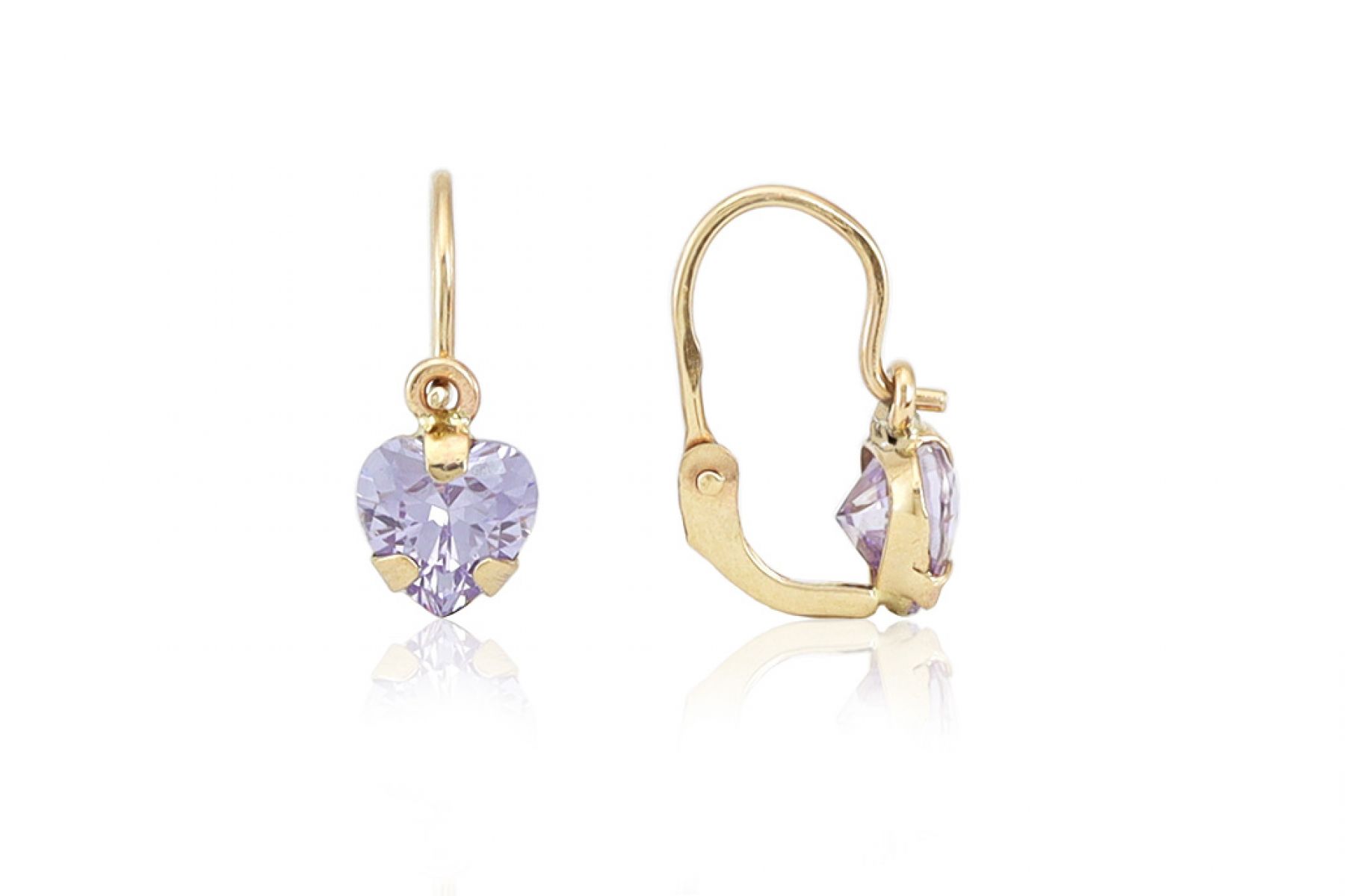 Ez az egyik legaranyosabb arany gyermek fülbevalónk! A lila kövecskék vidáman szikráznak a szívecskék közepén, bájos hatást kölcsönözve viselőjének.