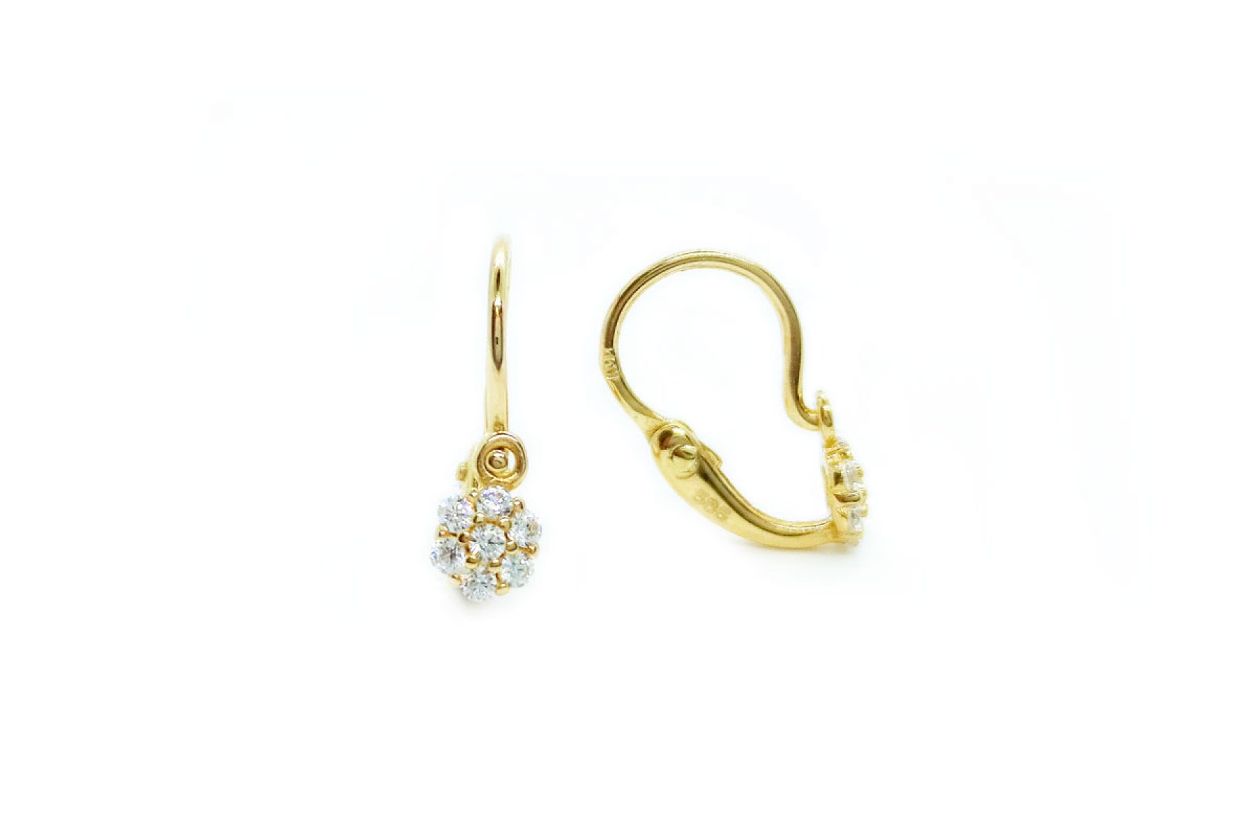 Amennyire aprócska, annyira szép és elegáns ez a szikrázó fehér cirkónia kövecskékkel díszített virágos arany fülbevaló. Már újszülöttek is hordhatják!
