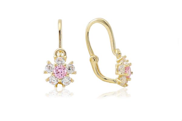 Amennyire aprócska, annyira szép és elegáns ez a szikrázó rózsaszín és fehér cirkónia kövekkel díszített arany elölkapcsos virágos fülbevaló.