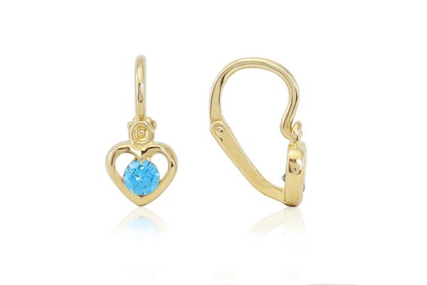 Arany baba fülbevaló elölkapcsos áttört szív nagy világoskék kővel