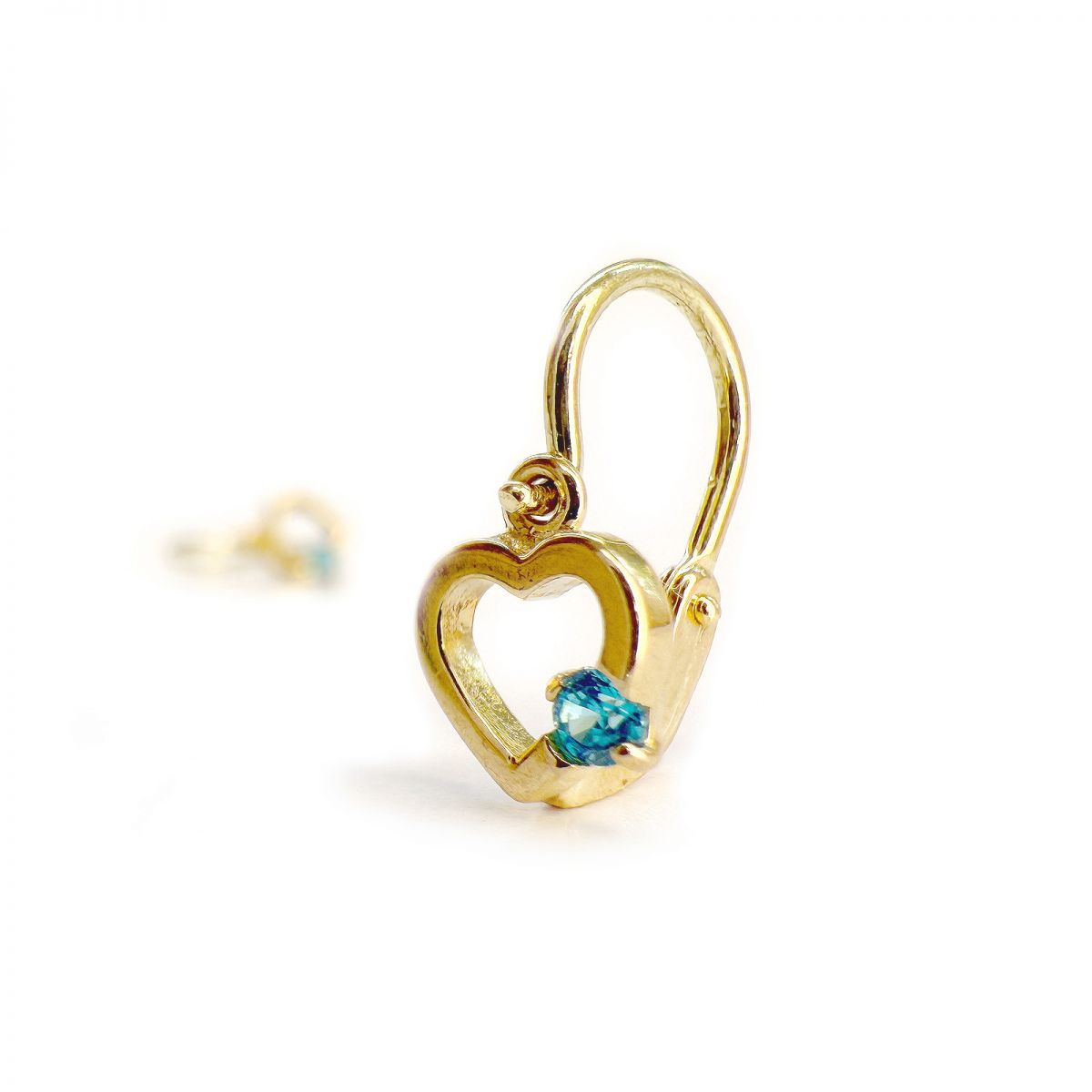 Arany baba fülbevaló kék oldalt kővel - áttört szív forma, 14K előlkapcsos zár