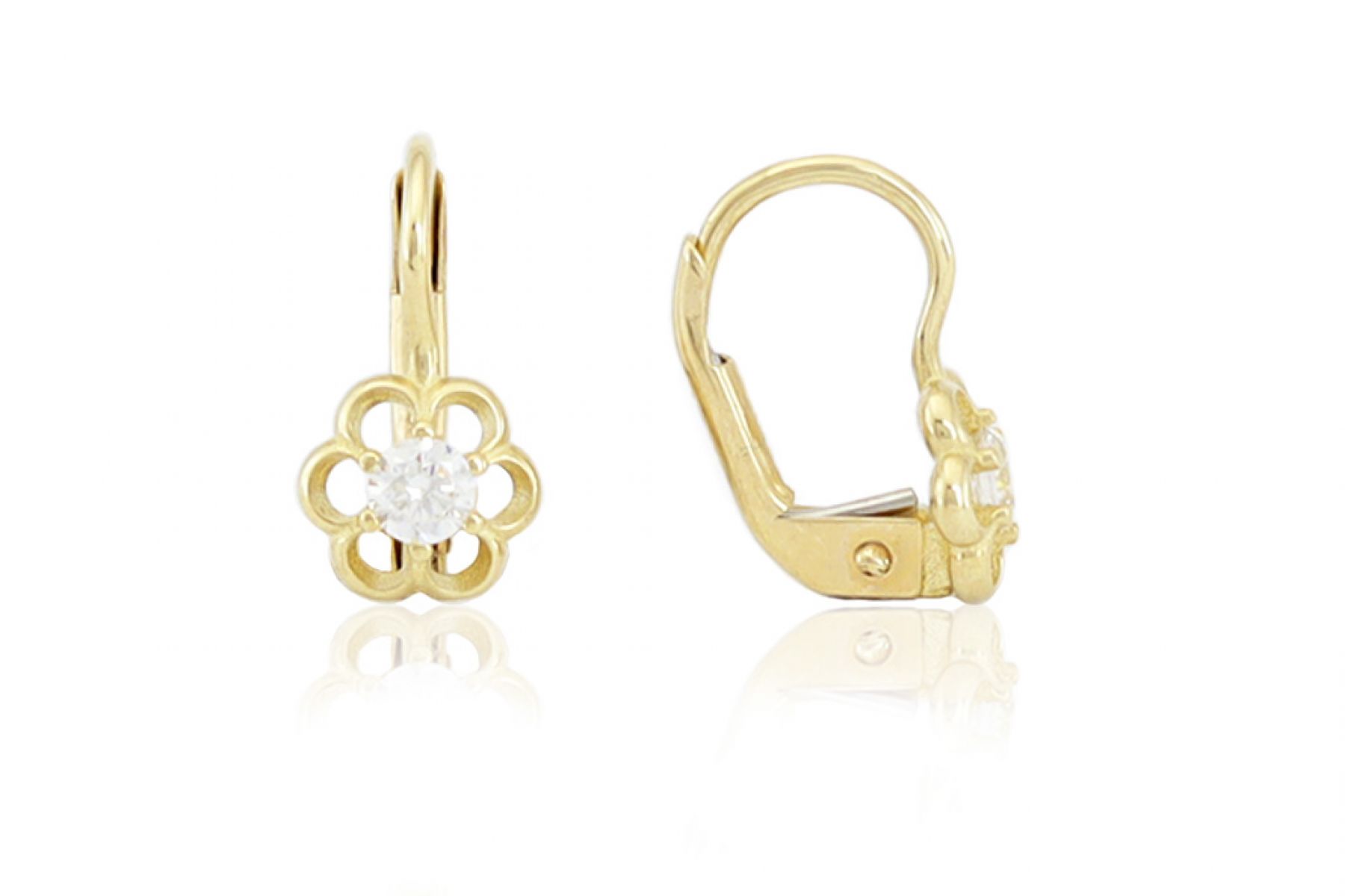 Arany baba fülbevaló patentzáras áttört virág fehér kővel