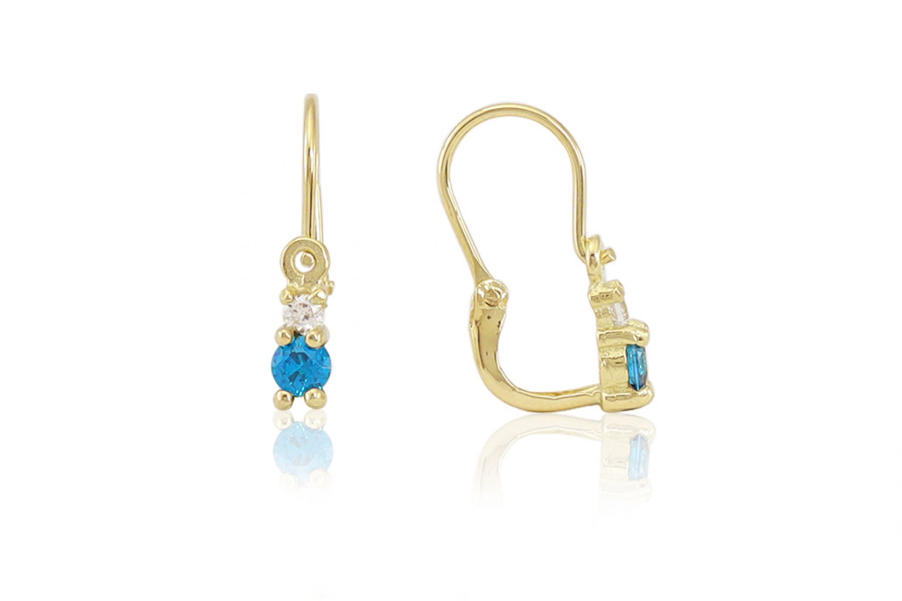 Arany gyermek fülbevaló elölkapcsos szoliter kék és fehér kővel