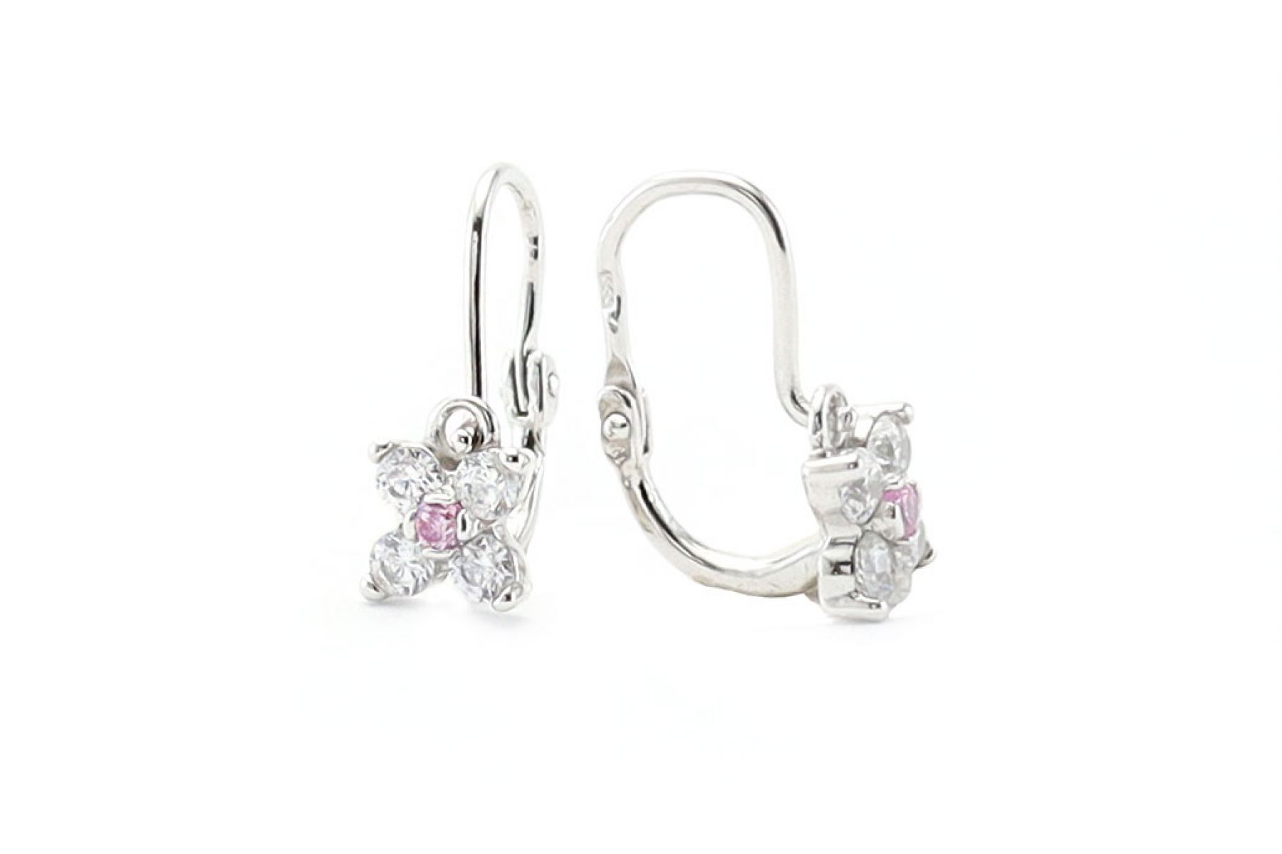 Amennyire aprócska, annyira szép és elegáns ez a szikrázó rózsaszín és fehér cirkónia kővel díszített fehér arany viriágmintás fülbevaló.