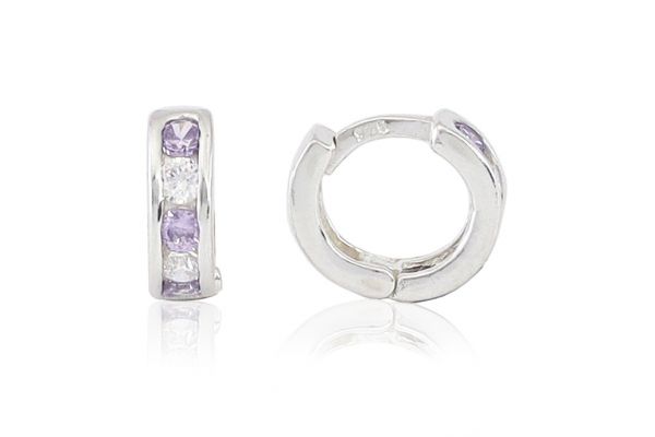 Ezüst baba fülbevaló bepattintós karika halványlila és fehér kövekkel 6mm