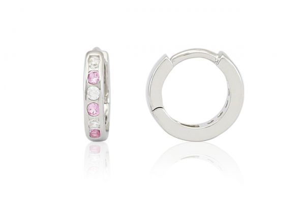 Ezüst gyermek fülbevaló keskeny karika rózsaszín és fehér kövekkel
