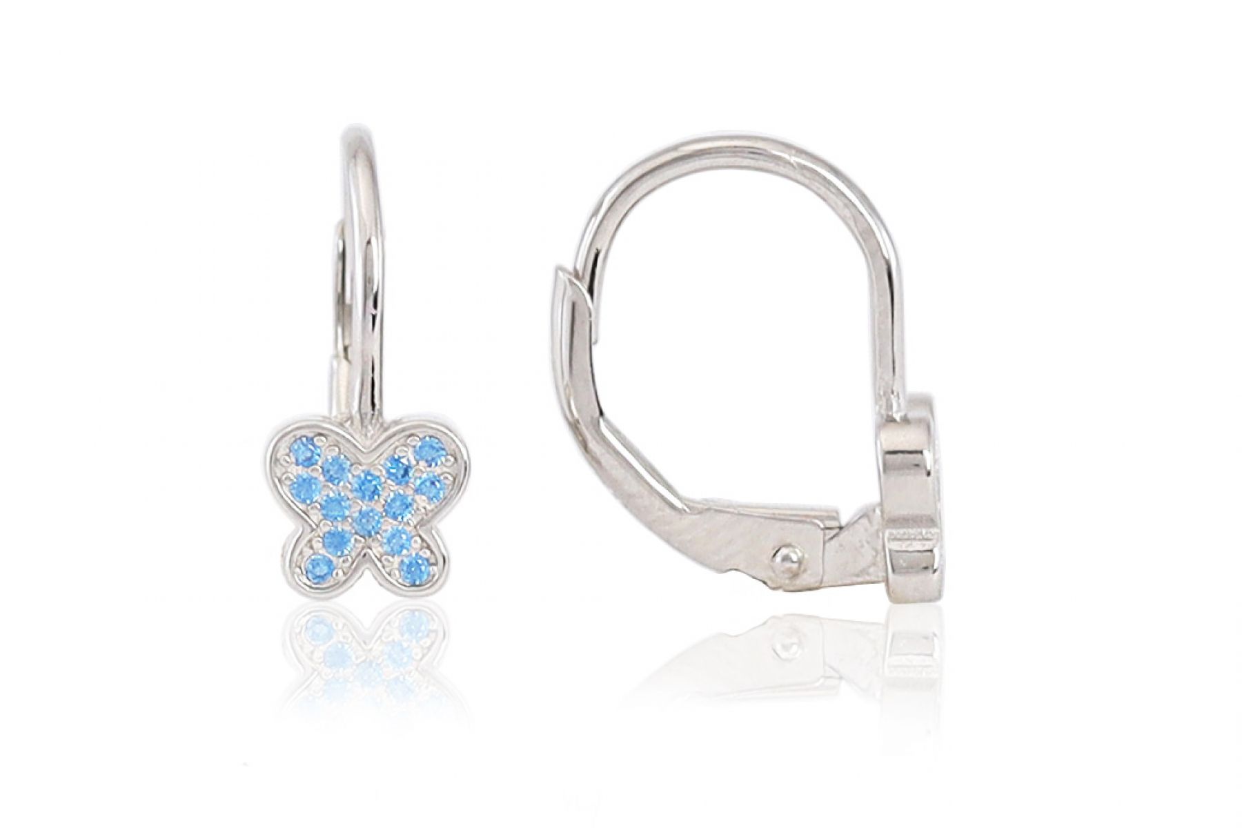 Ezüst gyermek fülbevaló patentzáras pillangó sok apró kék kővel